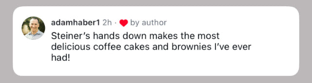 By 2010, my brother Jeffrey and I knew she was close to cracking the code. So we jumped the gun (as children do) and built the brand: Steiner’s Coffee Cake of New York—now Steiner’s Baking Co. Nanci, ever the realist, tried to keep our feet on the ground: “You know, I might not get this right…”